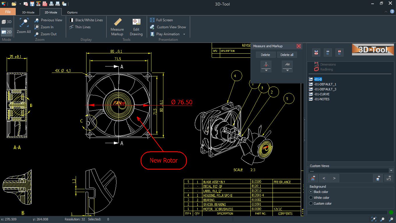 3D-Tool supports DWG, DXF, CATDrawing and SLDDRW drawings and features 2D measurement tools, redline markups, as well as tools to edit drawing elements.